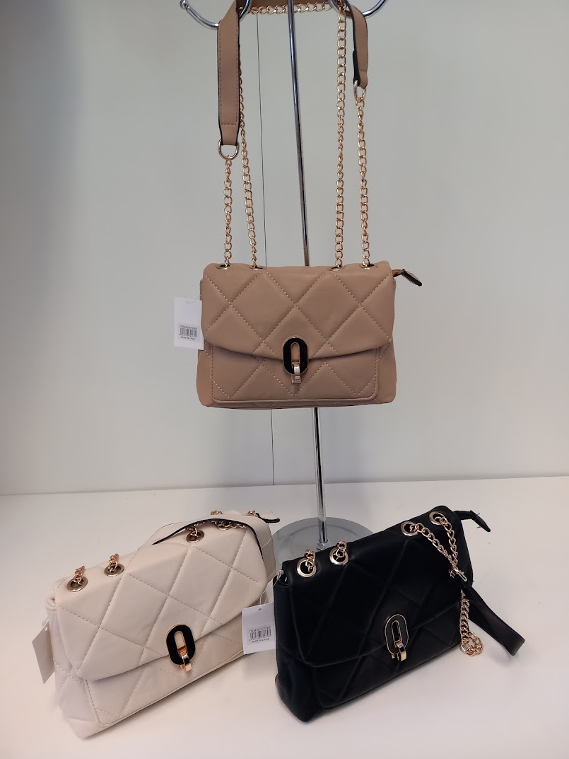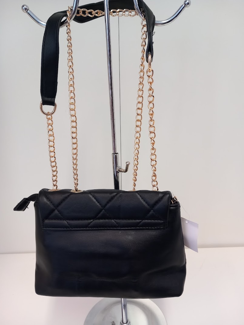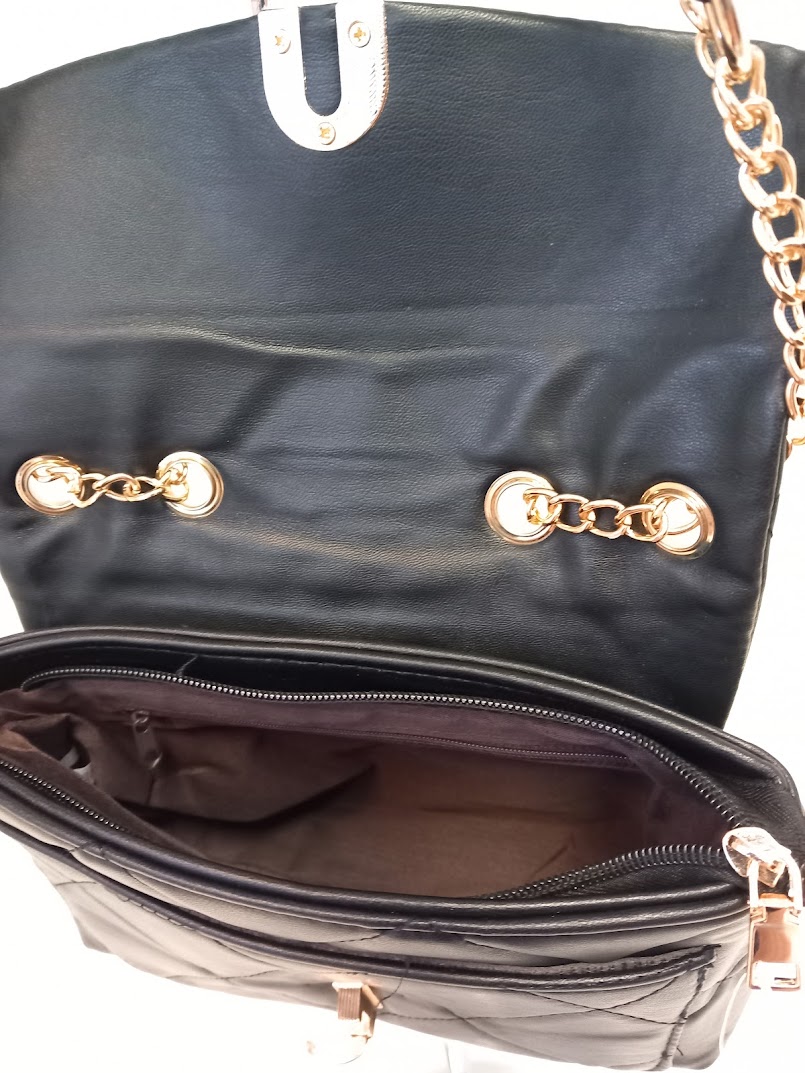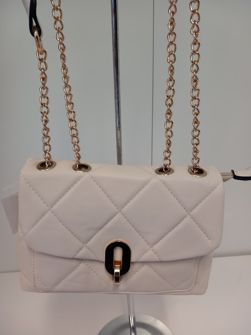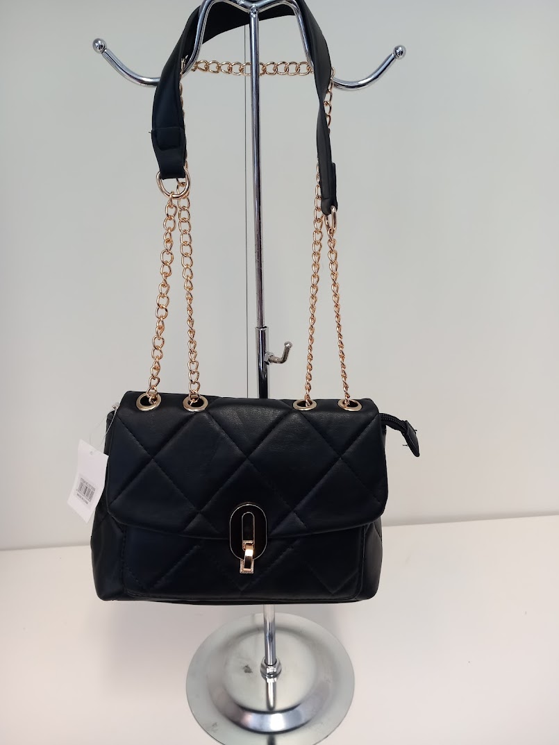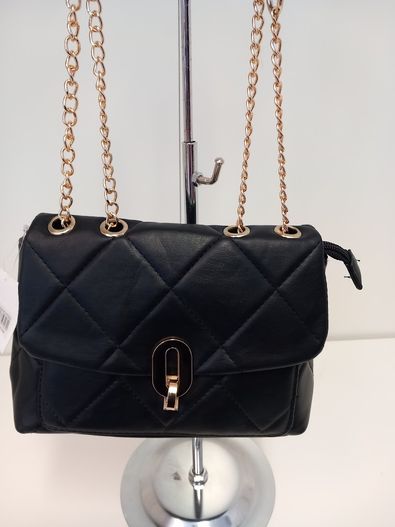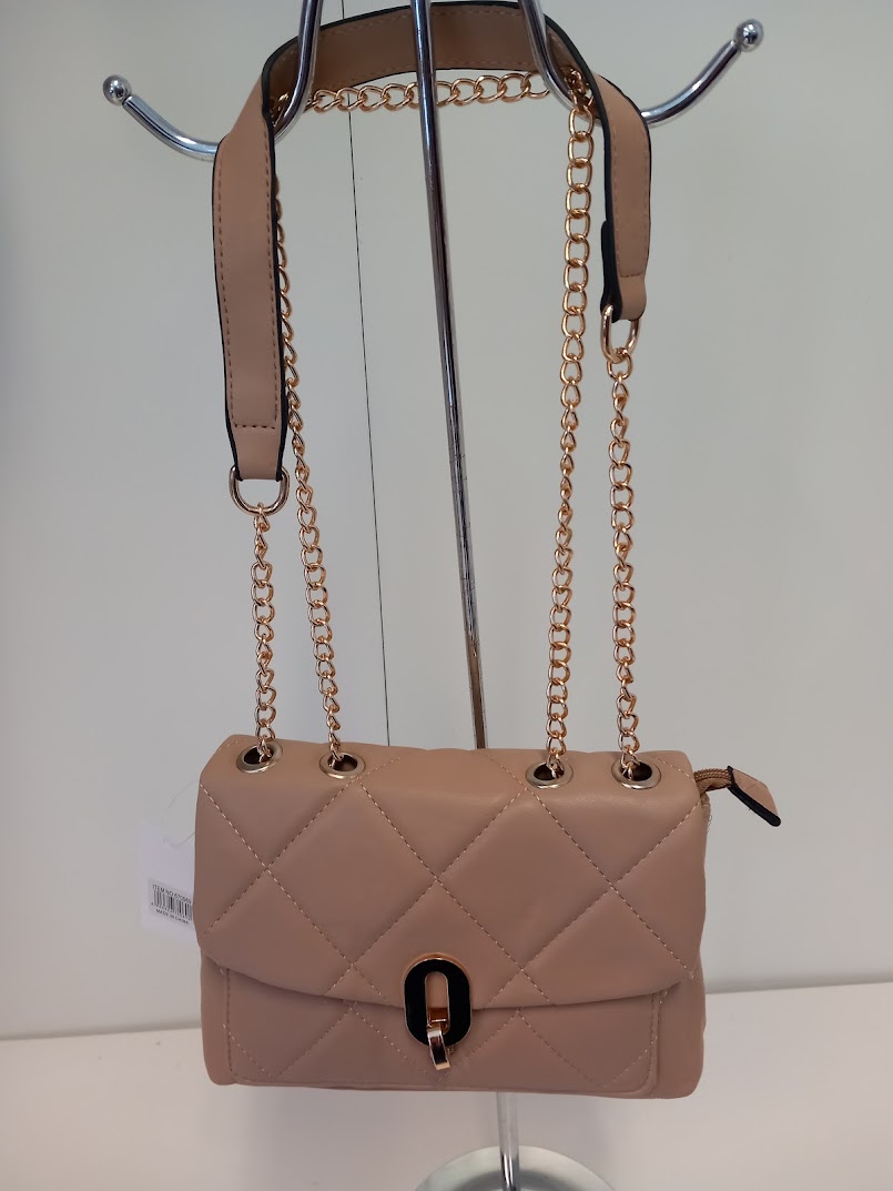 Olkalaukku kauniilla kullanvärisellä ketjuhihnalla.
